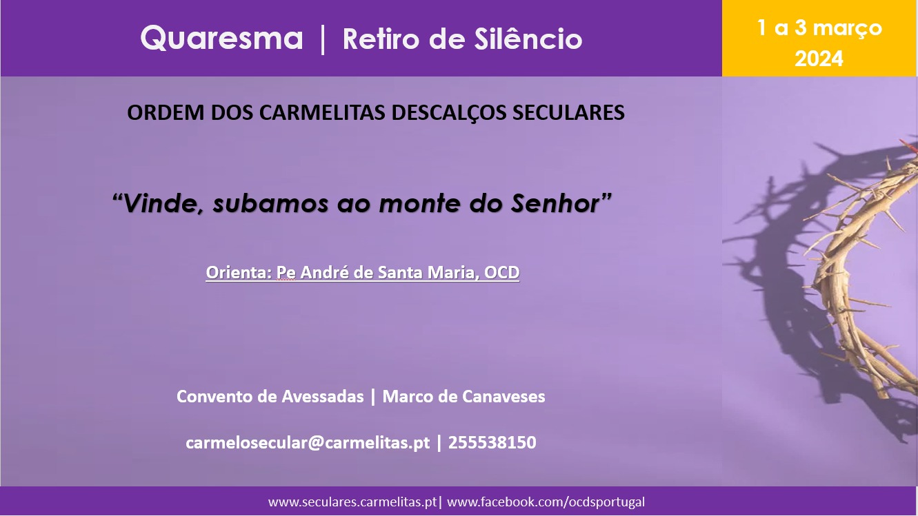 Ordem dos Carmelitas Descalços Seculares em Portugal vai promover, no fim-de-semana de 1 a 3 de março, a realização de um retiro de Quaresma no Convento de Avessadas, Marco de Canaveses. Destina-se a todos quantos desejarem preparar, com momentos de silêncio e de oração mais intensa, a Paixão e Ressurreição do Senhor. Sob orientação do Padre André de Santa Maria (ocd), num ambiente de recolhimento que intercalará com breves meditações e propostas de reflexão, o retiro centrar-se-á na frase do livro de Isaías: “Vinde, Subamos ao monte do Senhor” (Isaías 2, 2-3).